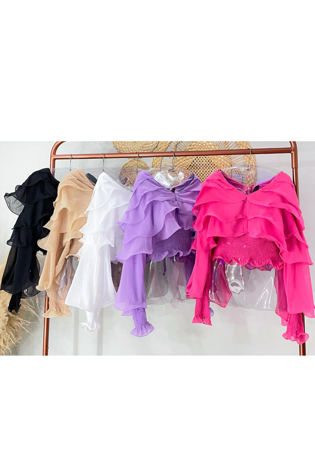 A Blusa Manga Longa com Babados, As mangas longas oferecem cobertura e conforto, perfeitas para dias mais frescos. Não possuem bojo, proporcionando um ajuste natural e confortável. Tanto na barra da blusa quanto nos punhos das mangas, há elastex, o que adiciona um detalhe de acabamento e permite um ajuste mais confortável e seguro. Tanto na frente quanto nas costas, a blusa possui um decote em V, que é lisonjeiro e feminino, adicionando um toque de sofisticação ao visual. Nas costas, há um fechamento com cordão, que permite ajustar a blusa conforme necessário, proporcionando um ajuste personalizado e um toque de estilo adicional. Em toda a peça, há babados sobrepostos, que adicionam textura, movimento e um toque de delicadeza ao design. Esses babados conferem uma estética fluida e romântica à blusa, tornando-a uma escolha encantadora para diversas ocasiões.