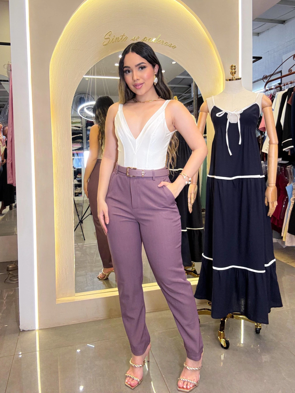 A Calça Cátia traz a sofisticação da alfaiataria com um toque moderno da modelagem cenoura. De cintura alta e levemente ajustada no tornozelo, valoriza a silhueta e oferece conforto ao vestir. Possui bolsos laterais, passantes na cintura e acompanha cinto do mesmo tecido com fivela dourada trabalhada, que garante acabamento elegante à peça.