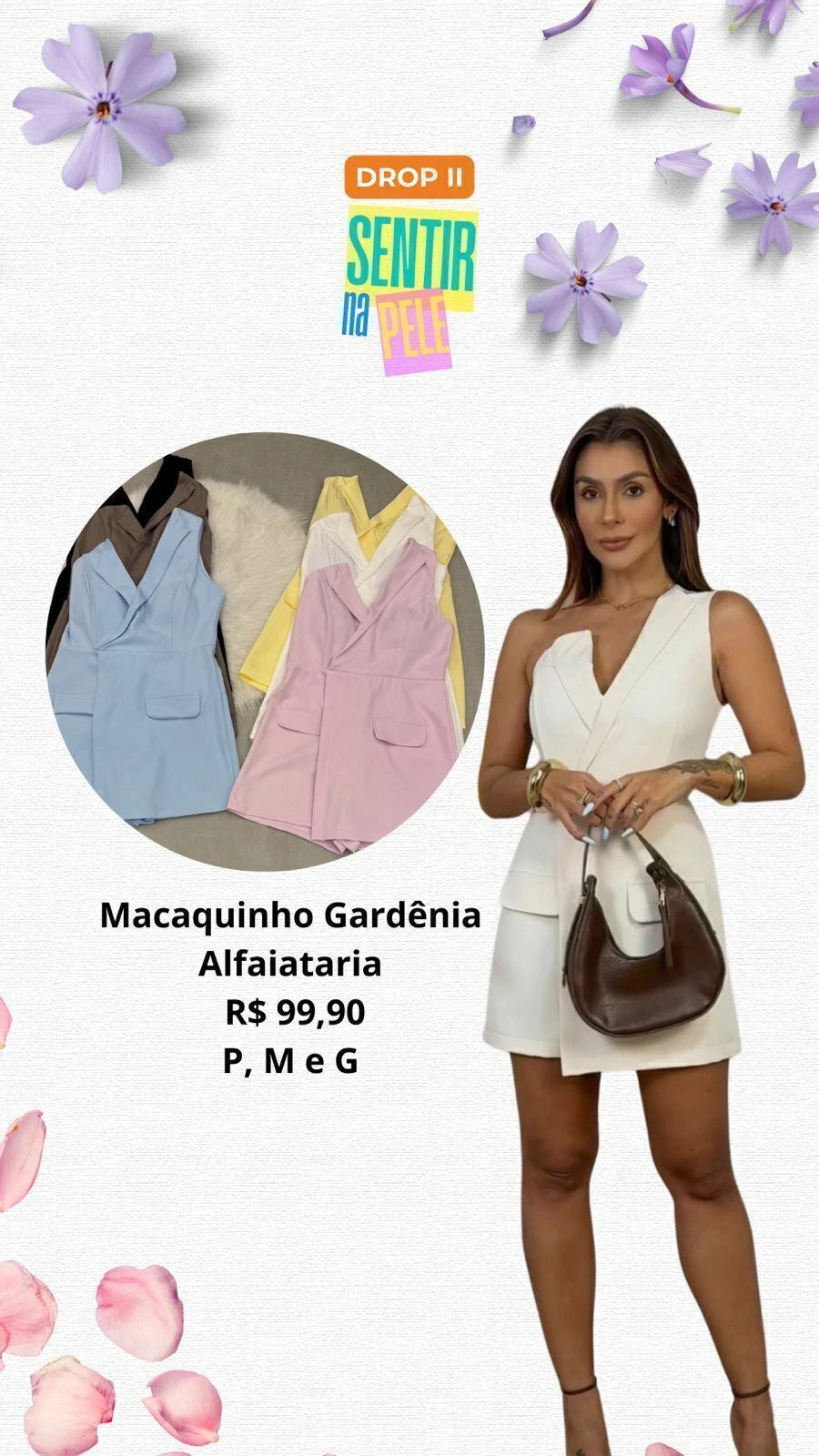 A modelo mede 1,60 m, pesa 61 kg, busto 88 cm, cintura 70 cm, quadril 98 cm, e está vestindo tamanho P.